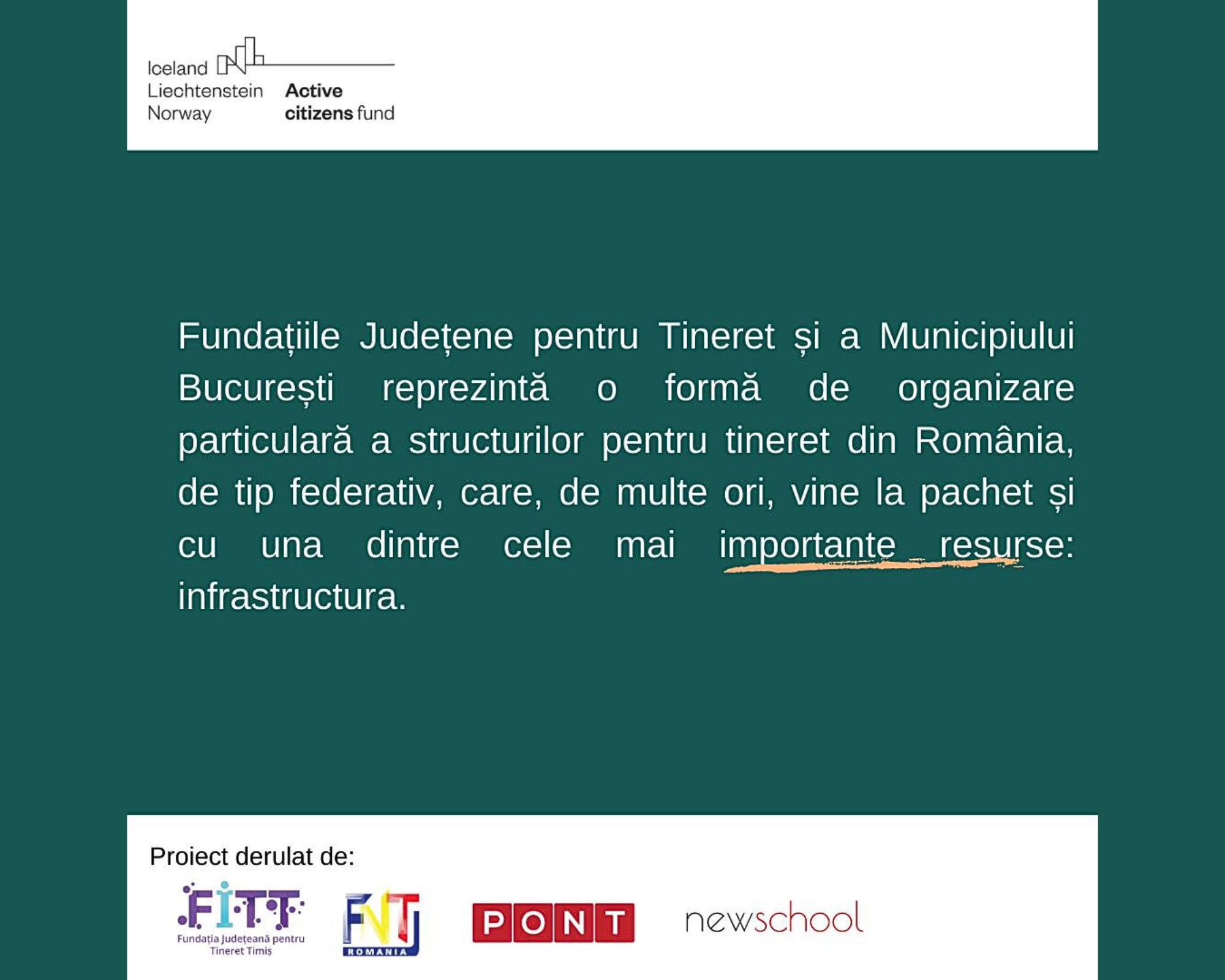 Proiectul „Revitalizarea sectorului de tineret din România” este derulat de Fundația Județeană pentru Tineret Timiș, în parteneriat cu Fundația Națională pentru Tineret, PONT și @Newschool și beneficiază de finanțare prin Active Citizens Fund – Romania, program finanțat de Islanda, Liechtenstein și Norvegia prin Granturile SEE 2014-2021.